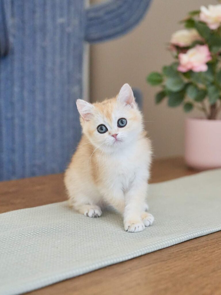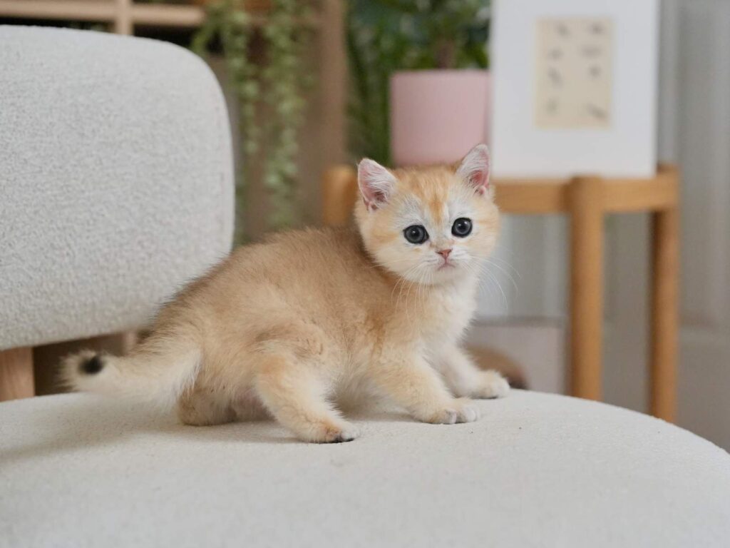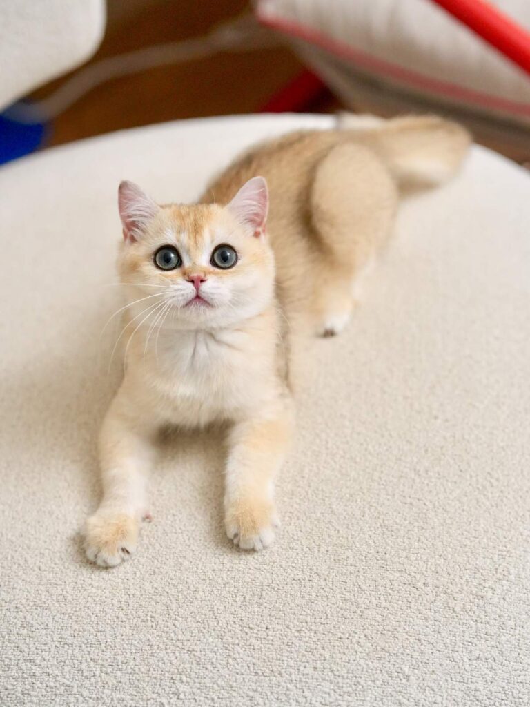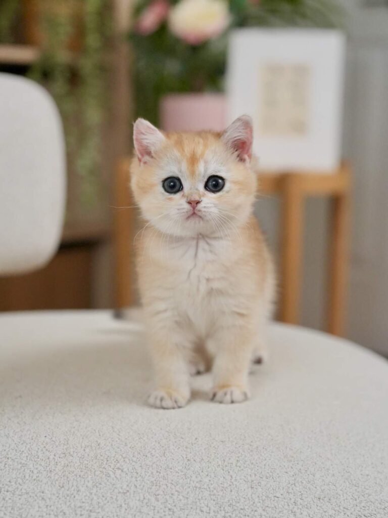 Pomelo is a golden shaded British Shorthair boy with a strong body, a round face, and bright green eyes that instantly catch your attention. He combines the best of two beautiful lines, the solid structure and “bear head” look from Carson, a golden shaded British Shorthair, plus the sweet facial details from Violet, a golden shaded British Longhair. The result is a British Shorthair who feels powerful in hand, but looks soft and charming in the face. If you want a British Shorthair kitten for sale that balances great body type with a sweet expression, Pomelo is a wonderful choice.
