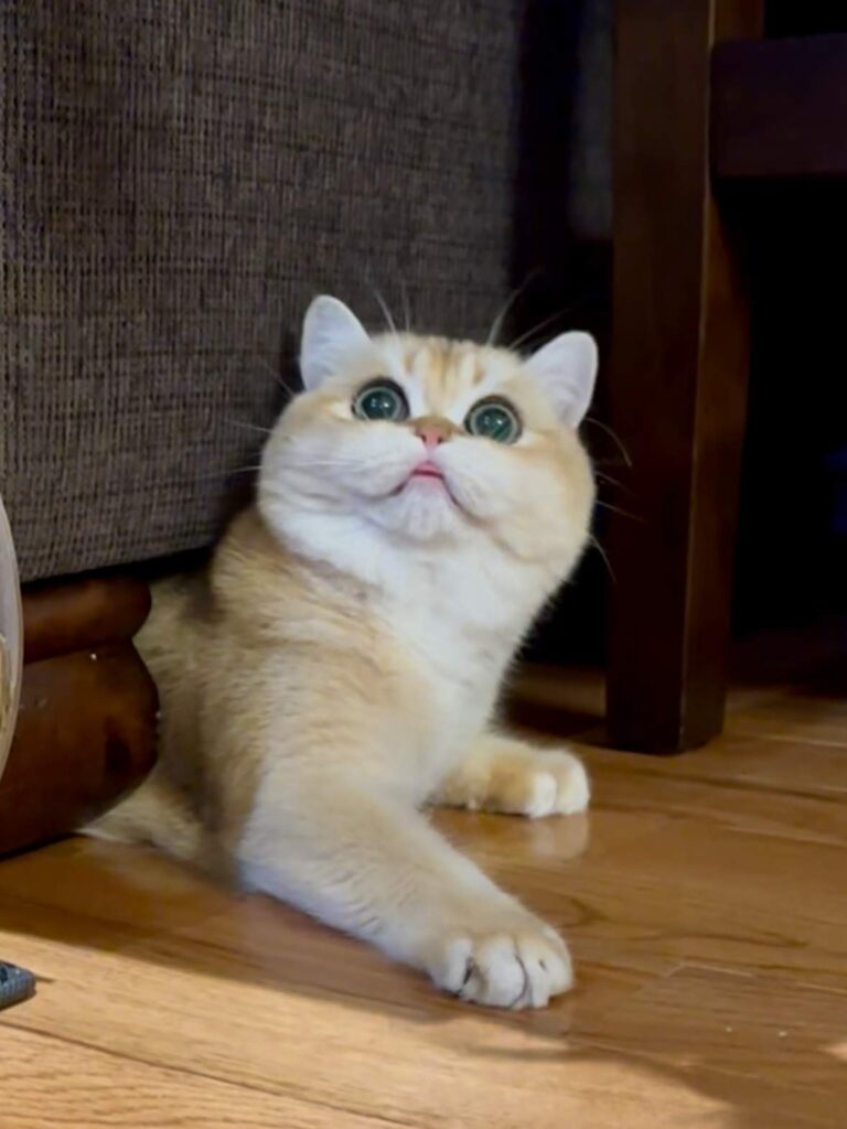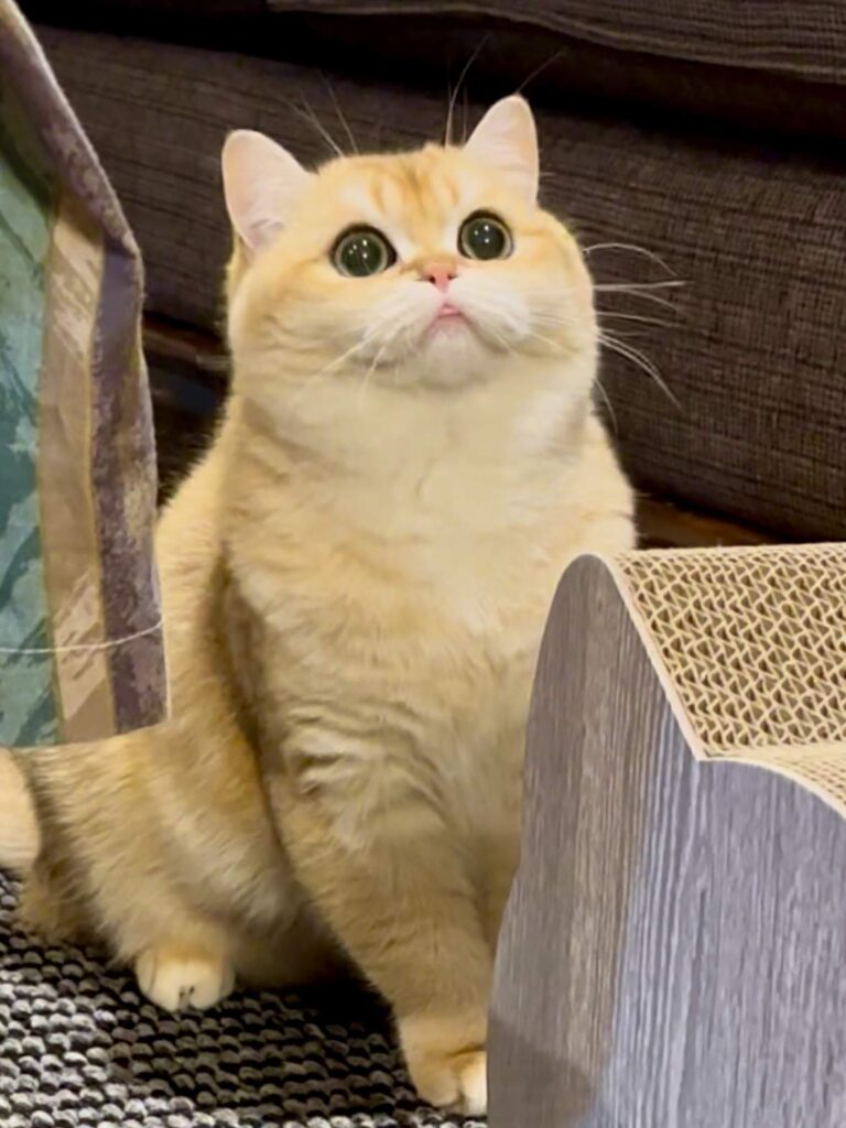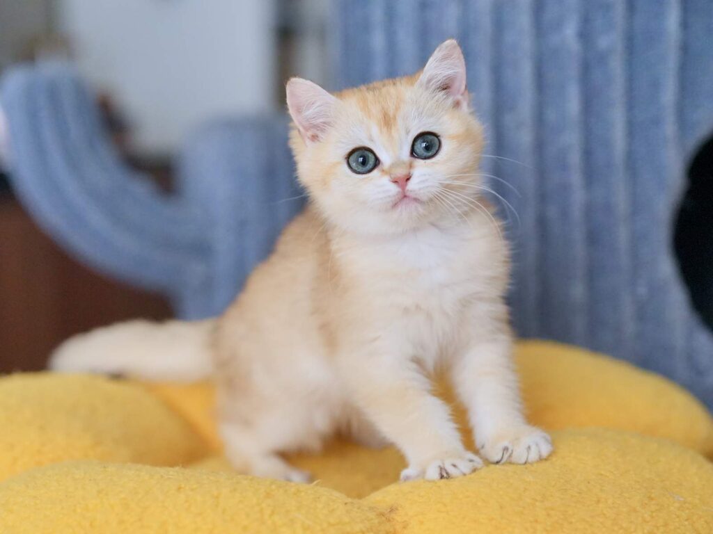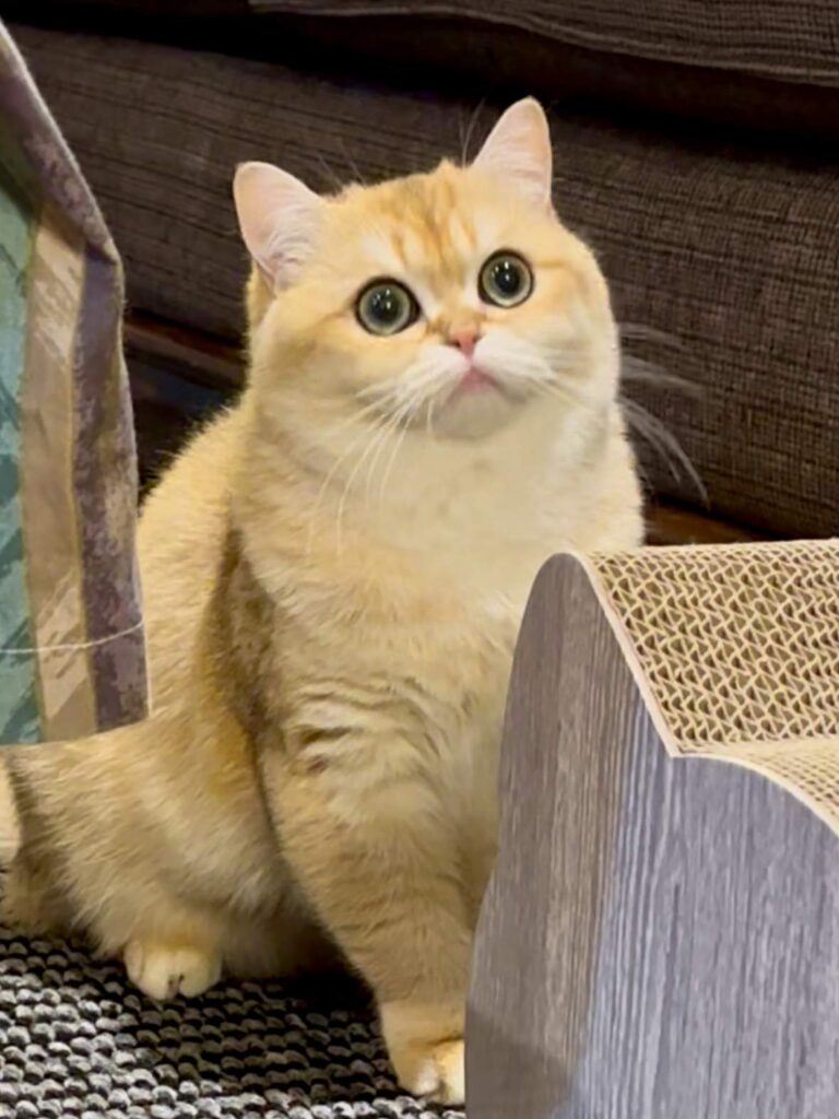 Pomelo is a golden shaded British Shorthair boy with a strong body, a round face, and bright green eyes that instantly catch your attention. He combines the best of two beautiful lines, the solid structure and “bear head” look from Carson, a golden shaded British Shorthair, plus the sweet facial details from Violet, a golden shaded British Longhair. The result is a British Shorthair who feels powerful in hand, but looks soft and charming in the face. If you want a British Shorthair kitten for sale that balances great body type with a sweet expression, Pomelo is a wonderful choice.