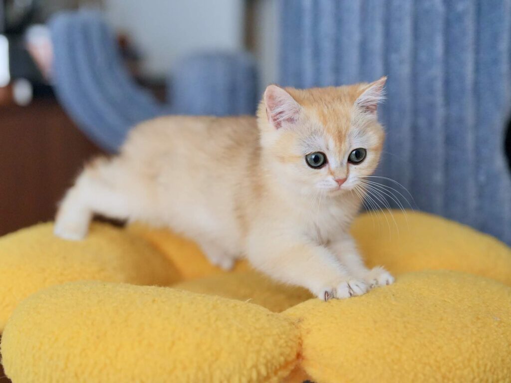 Pomelo is golden shaded with color code ny12, and his coat reads light, warm, and clean in natural light. The golden glow gives him a cozy, sunny vibe that looks especially beautiful next to his bright green eyes. His coat is dense and plush with a smooth touch, so he keeps that teddy bear texture people love in British Shorthair cats. As he matures, the shading stays soft and even, keeping the color looking bright instead of heavy.